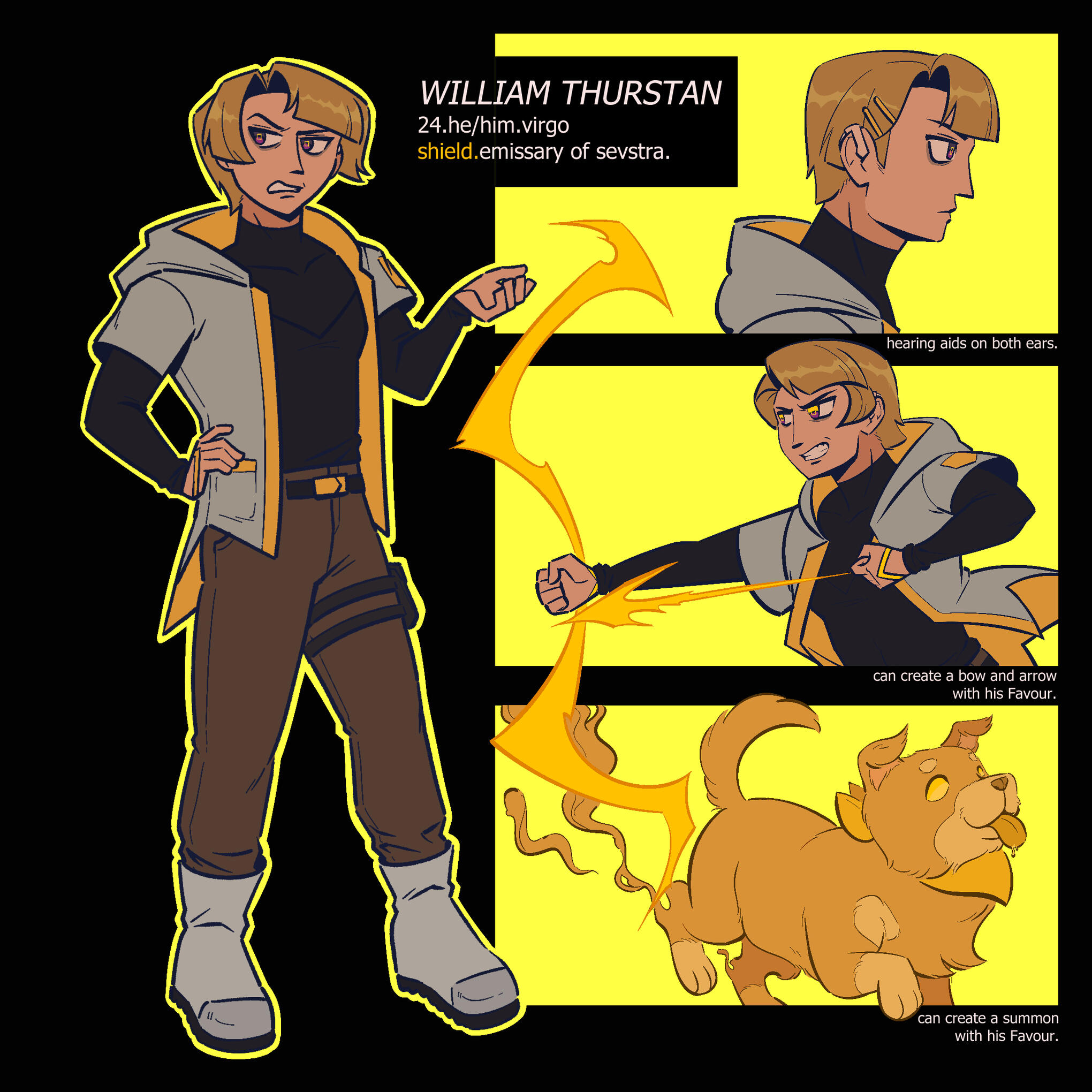 William is the workaholic incarnate. He is awful with people and would rather spend time with his dog. His blood is made of caffeine and he sees sleep as a waste of time. He has a raging inferiority complex. This guy needs therapy so bad it makes him look STUPID. While he has the God of Order as his patron, he carries very little Favour with him. He makes up for it with everything he possibly can and putting in 200% into everything.