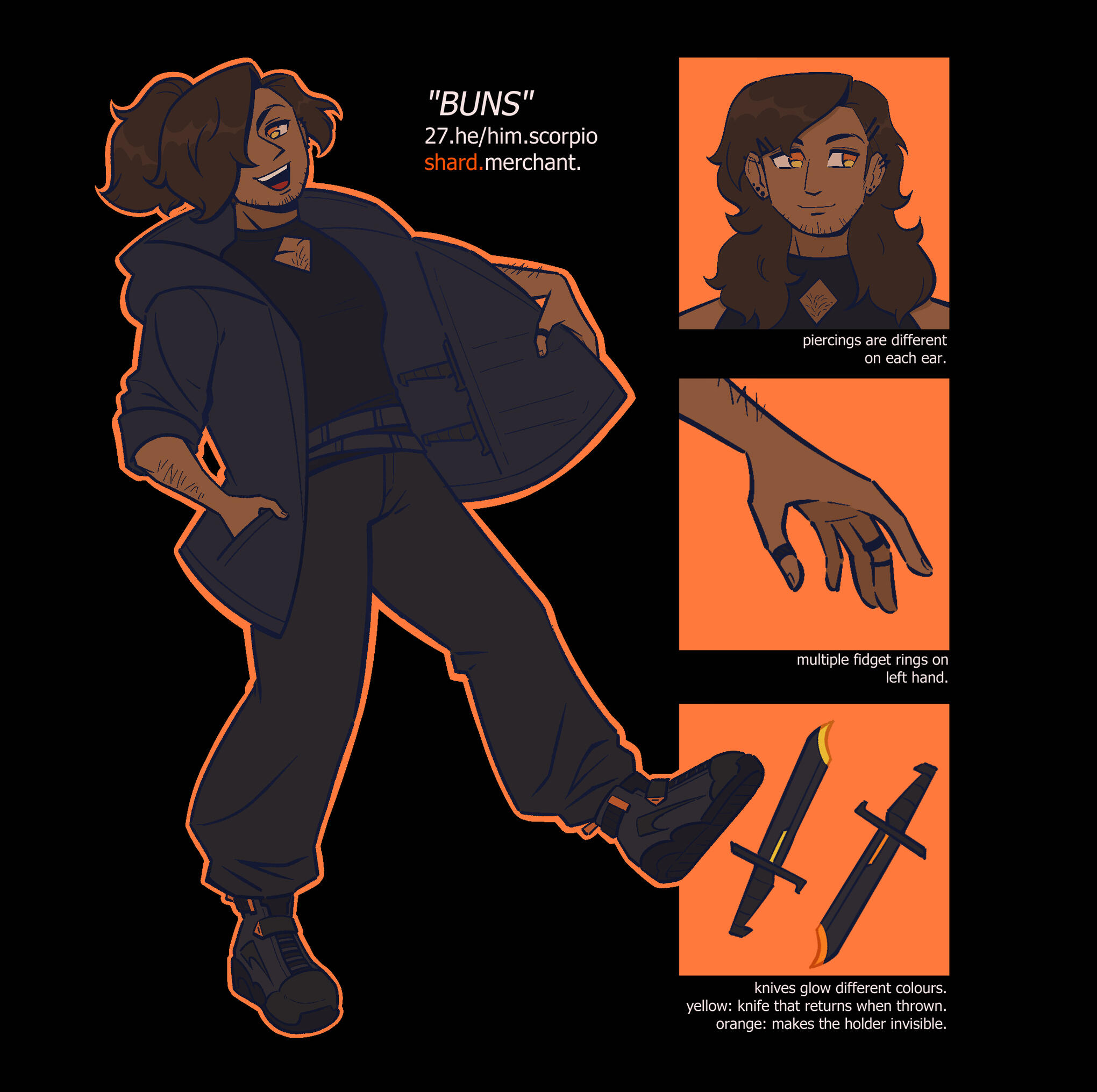 Information broker with clients on both sides of the law. Buns loves to sit on the side with popcorn while everyone else gets into messes for him to laugh at. With the God of Luck as his patron, Buns can manipulate luck to go his way, but he usually loves to roll with whatever punches are thrown at them. He'll sooner use his abilities to get into the worst situation ever for the hell of it. His knives also have a bunch of enchantments.