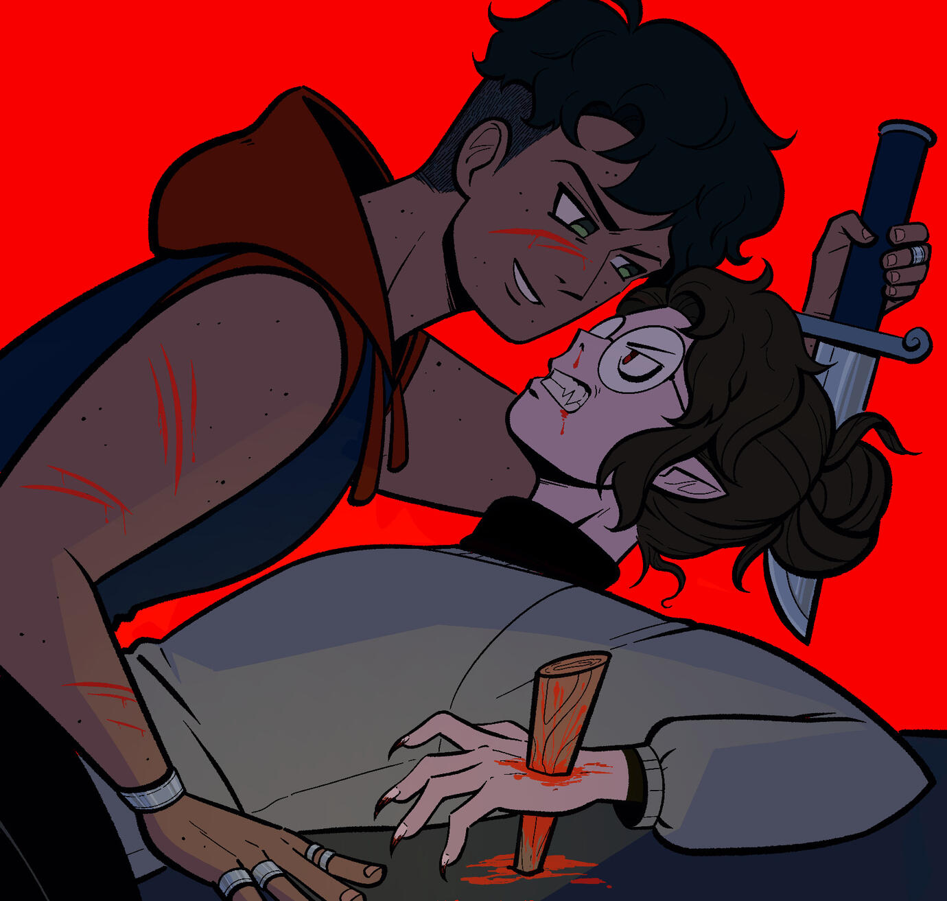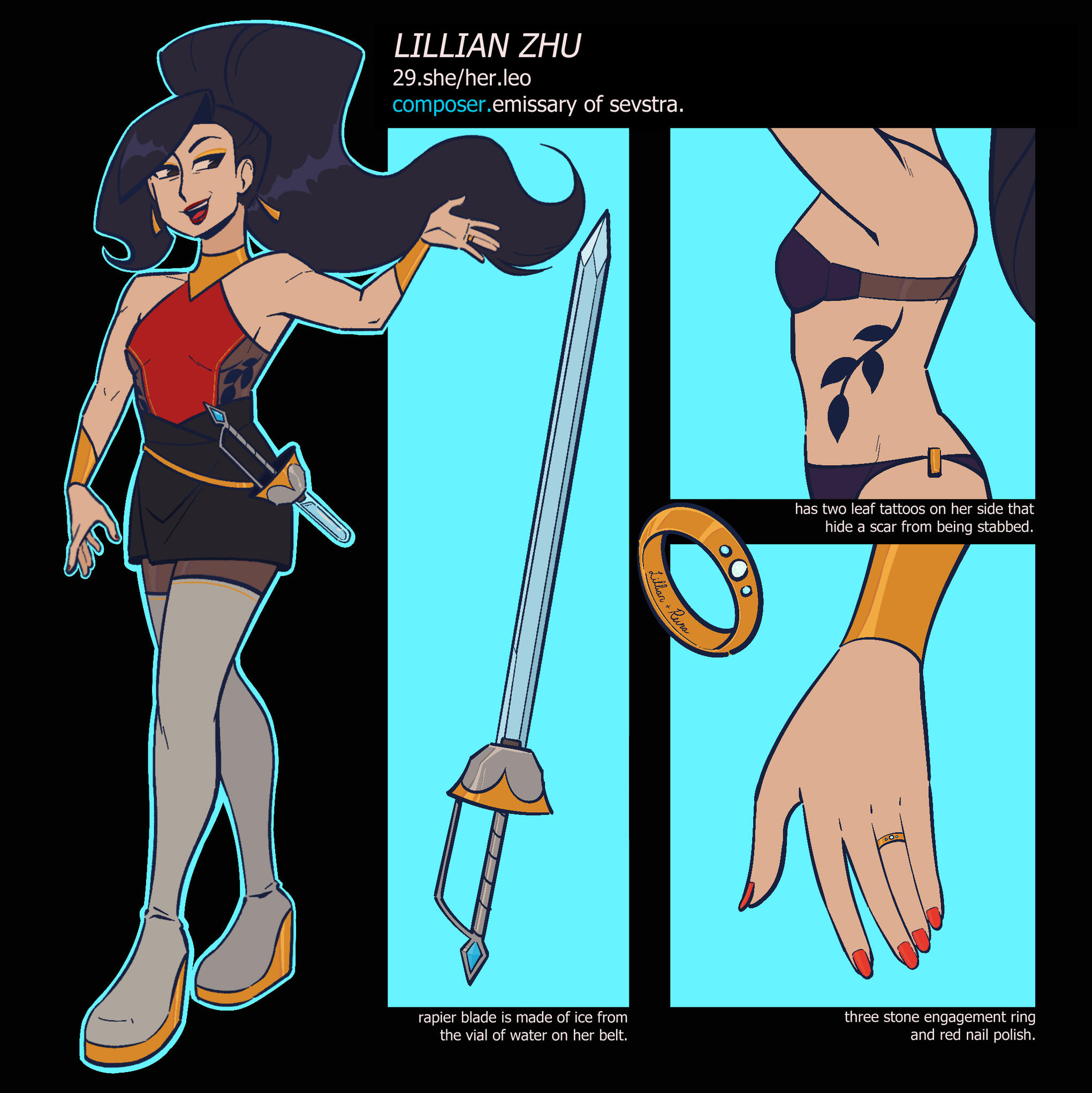 Lillian comes off strong, and if she thinks you're fun, she will never leave you alone. Obsessed with looking good, she will sacrifice almost all function for form. Lillian loves to play music with her fiance, loves creating metalwork for her god, and loves to paint! She's not the best painter, but she finds a lot of joy in the process. As an ooey gooey romantic, she is an absolute SIMP for her Reina.Lillian comes from a line of devout followers of the God of Creation and has a masterful understanding of the Favour she carries. She fights a lot like a Red Mage from Final Fantasy and functions mainly as a caster who can get in and get some good stabs in every now and then. She's resourceful and very quick thinking in combat.