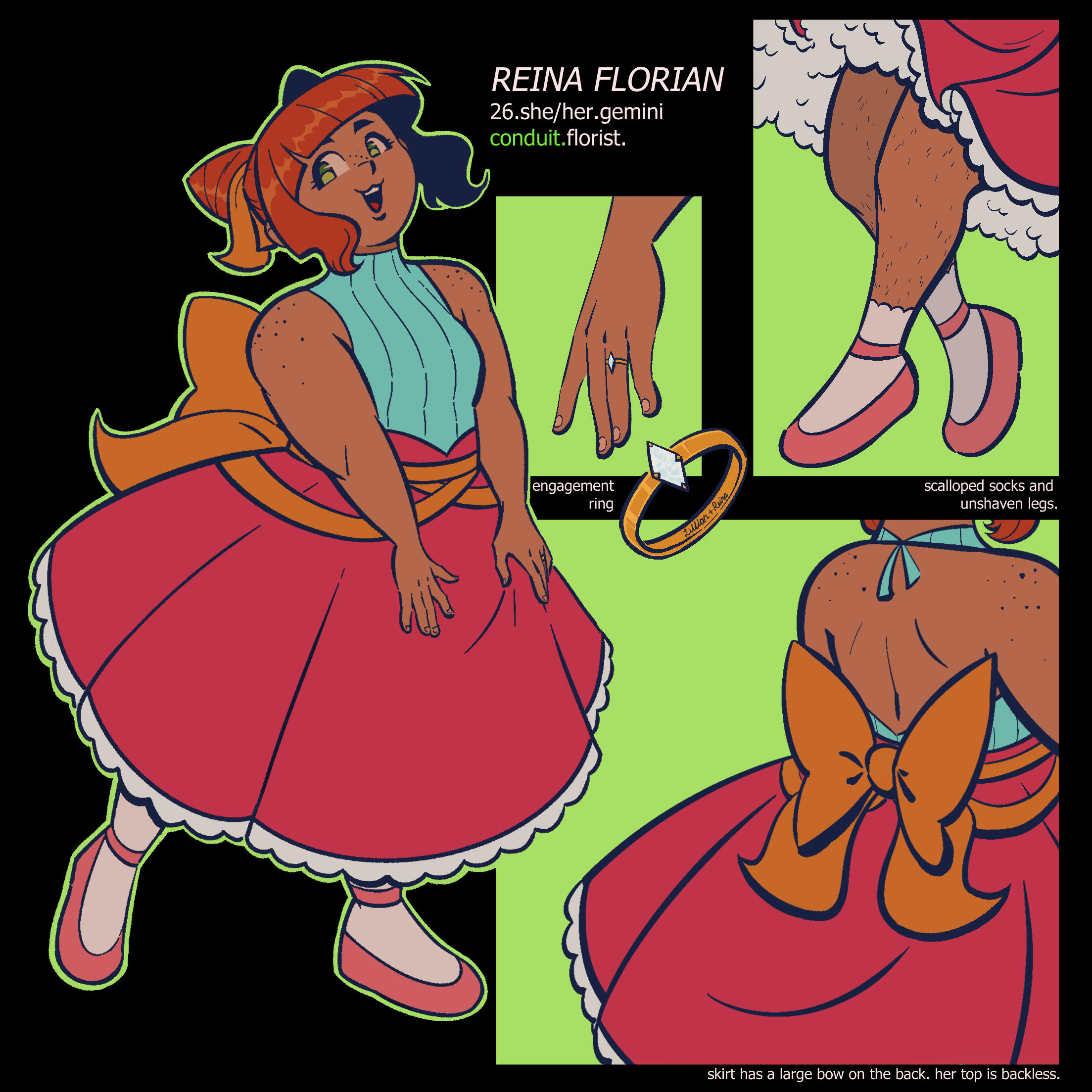 Reina is a florist and non combatant. She loves to tease her fiancee, Lillian. She's introverted, but not shy in the least. Reina is a source of calm understanding and often offers a new way to look at things. Even though she's has no combat skills, she would do anything to protect those she loves in her own way.Her Favour, granted by the God of Harvest, allows her singing to help calm plants and aid them to grow. It's a very gradual process that can take months depending on how stressed the plants are, or how big they are. Her abilities really help her business blossom.